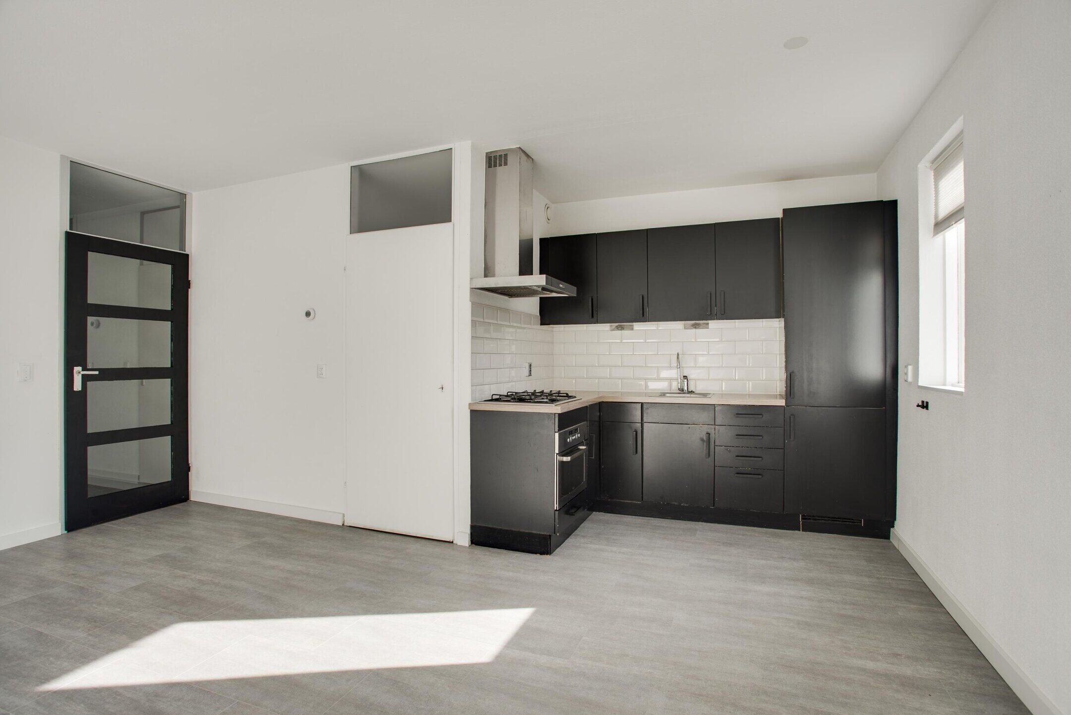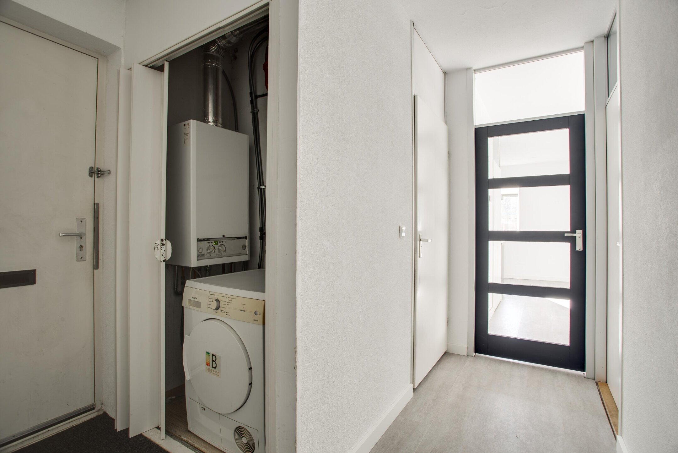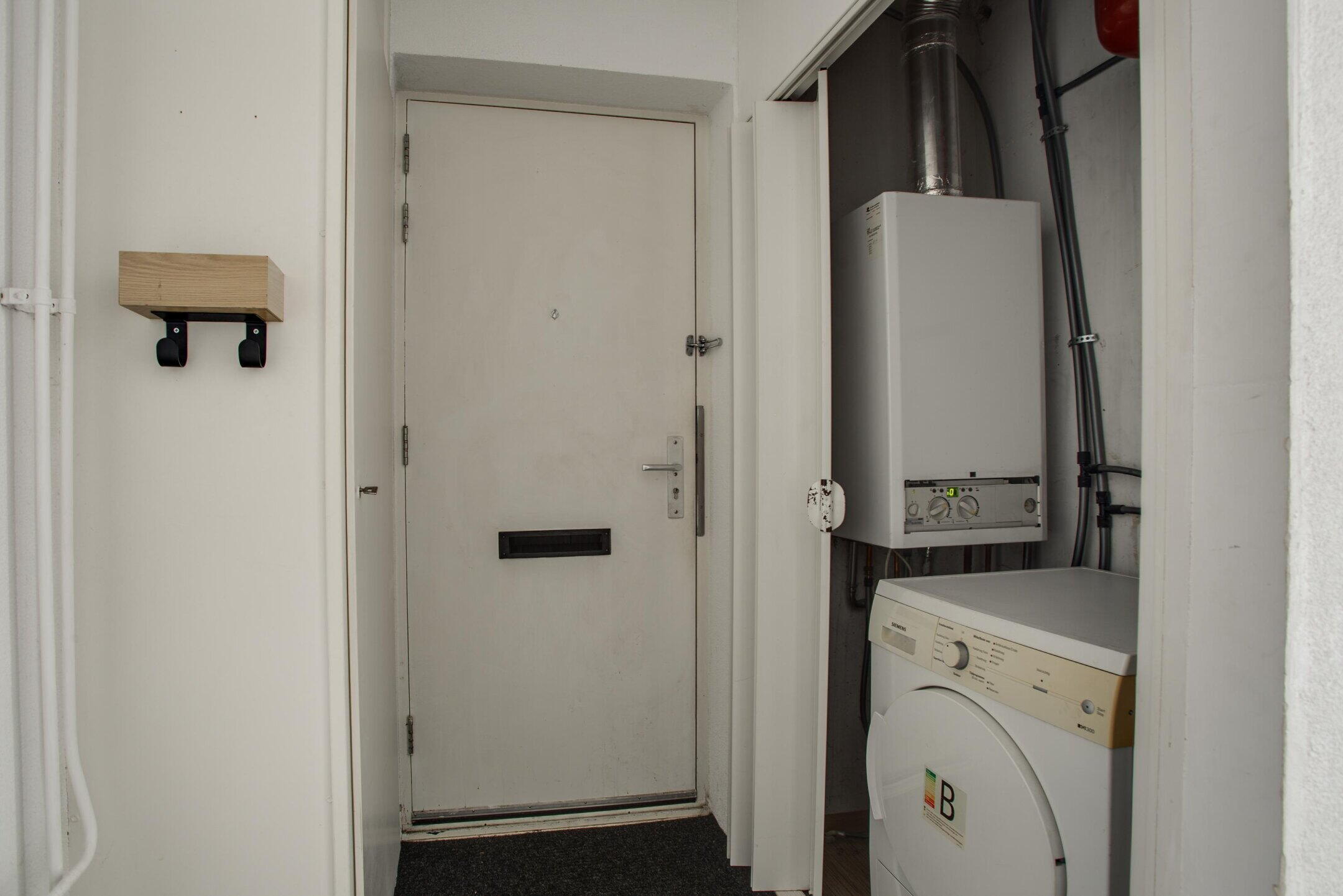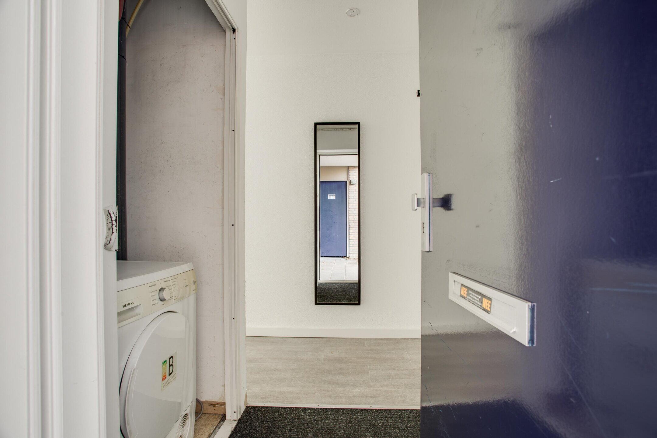 Via de entree komt u binnen in de hal, die toegang biedt tot de verschillende vertrekken van de woning. Aan de voorzijde bevindt zich de slaapkamer, een prettige ruimte met voldoende plaats voor een tweepersoonsbed en kastruimte. Vanuit de hal bereikt u tevens de moderne badkamer uit 2021, welke is voorzien van een inloopdouche, een toilet en een wastafel met meubel. Daarnaast is er in de hal een aparte opstelplaats aanwezig voor de cv ketel en de wasmachineaansluiting, netjes en praktisch gesitueerd.